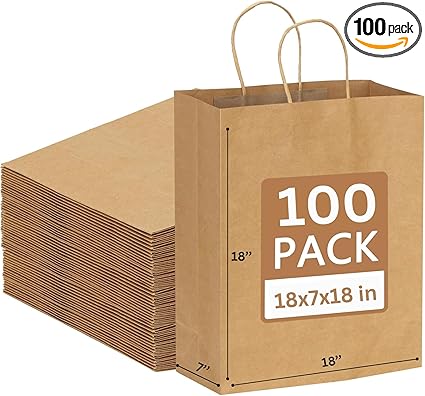 - 18x7x18 Inch [100 Pcs] Large Brown Paper Bags with Handles Ideal for Takeout, Grocery, Goody, Retail, Party, Gifts, Weddings -