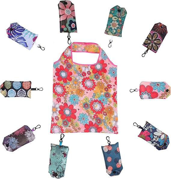 10 Pack Cute Floral Leaves Print Reusable Grocery Bags Portable Foldable Shopping Bag Shopping Tote with Hook