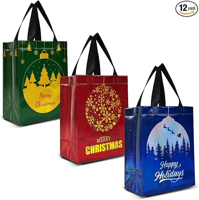 Reusable Christmas Gift Bags Medium Size – 12 Premium Christmas Bags With Handles & Holographic Finish - Xmas, Thanksgiving,